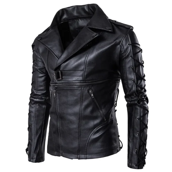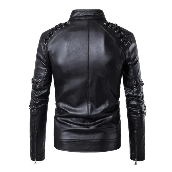 Mens Laced Military Gothic Black Genuine Sheepskin Racer Classic Fit Biker Leather Jacket