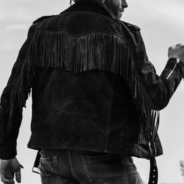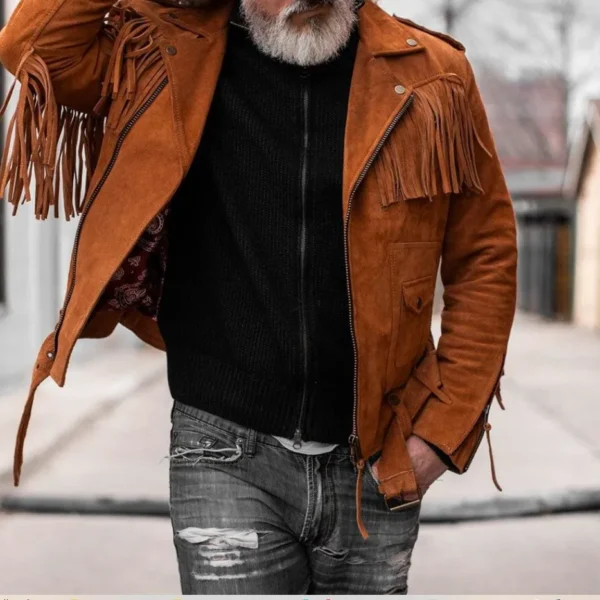 Men’s Suede Leather Belted Jacket – Western Style Cowboy Fringe, Biker Fringe Jacket