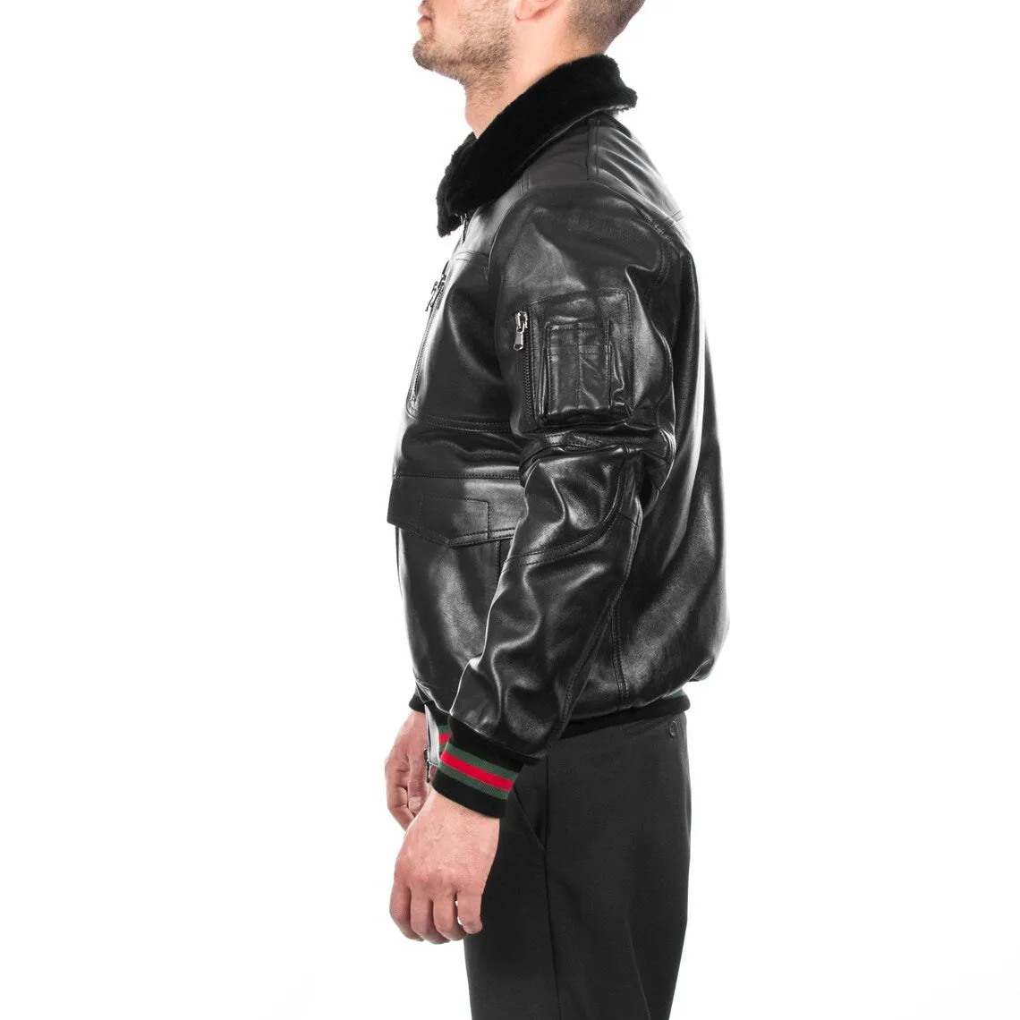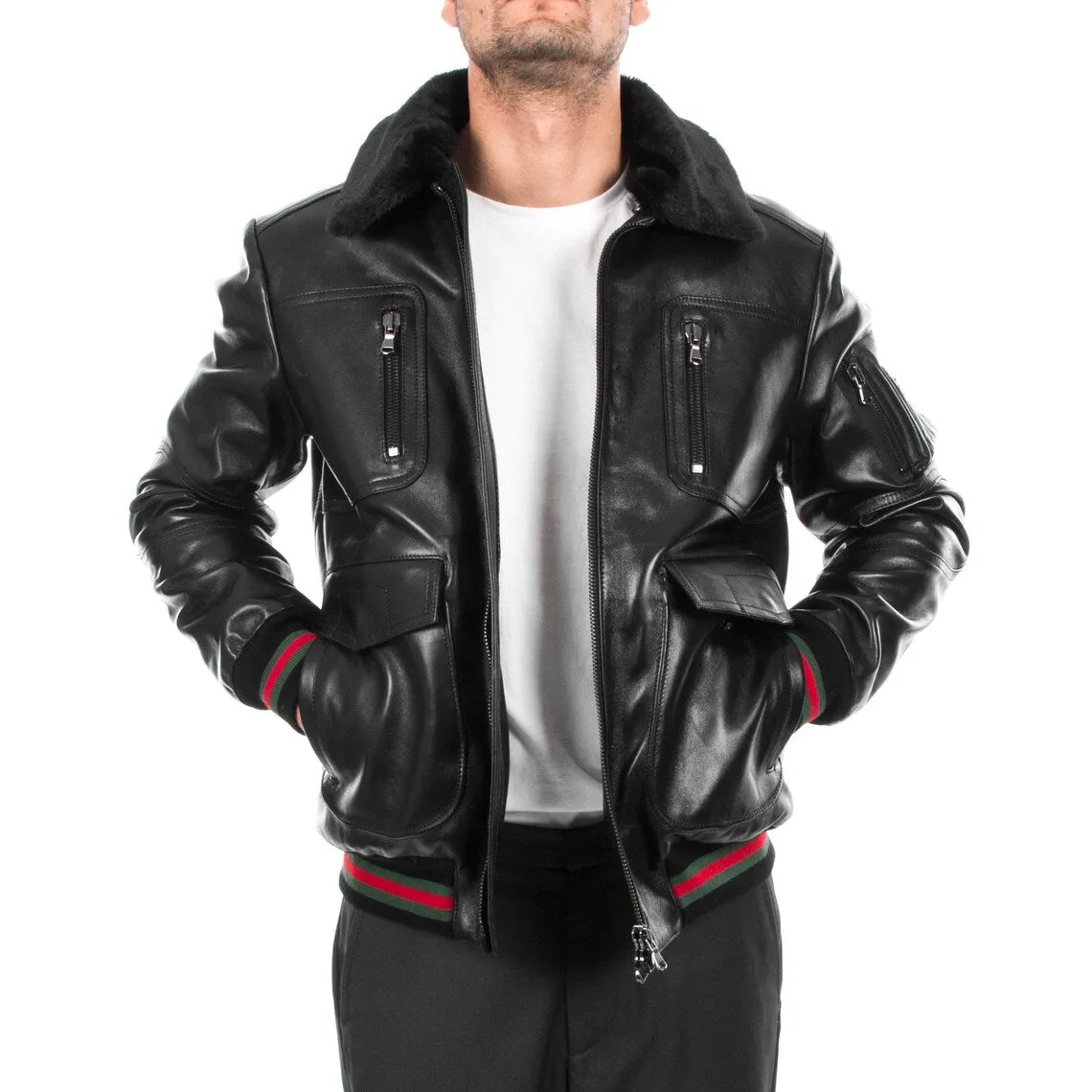 Handmade Men’s Genuine Lambskin Leather Bomber Jacket with Removable Fur Collar