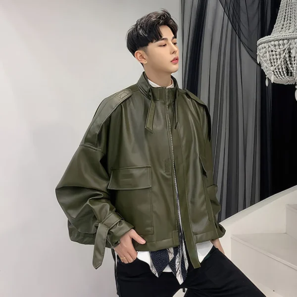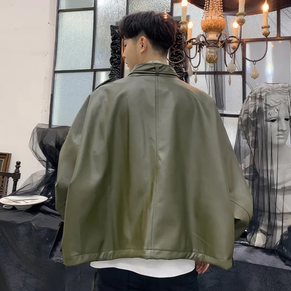 Mens Army Green Genuine Sheepskin Stand Collar Streetwear Oversized Loose Outfit Bat Sleeve Casual Fashionable Leather Jacket