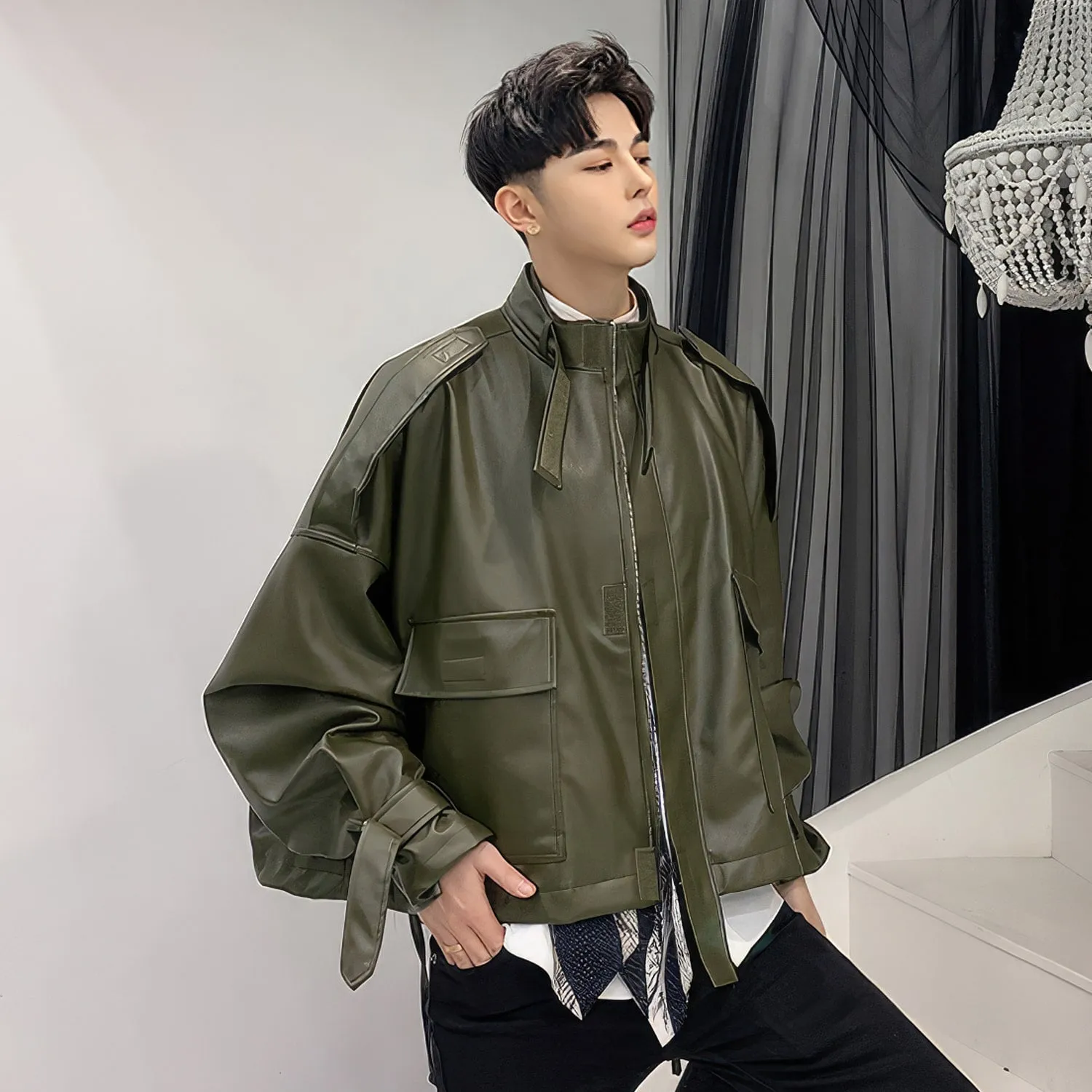 Be the first to review “Mens Army Green Genuine Sheepskin Stand Collar Streetwear Oversized Loose Outfit Bat Sleeve Casual Fashionable Leather Jacket”
