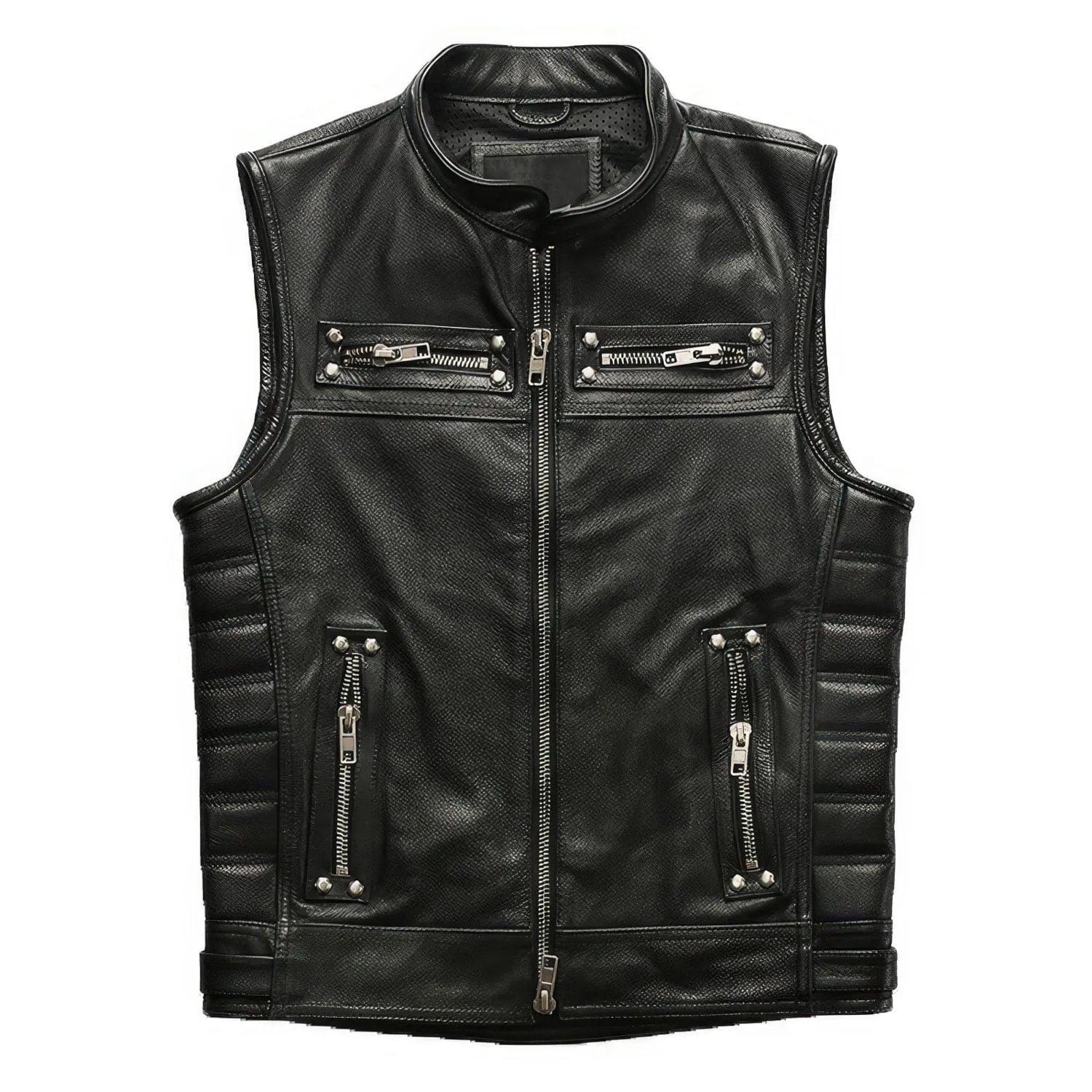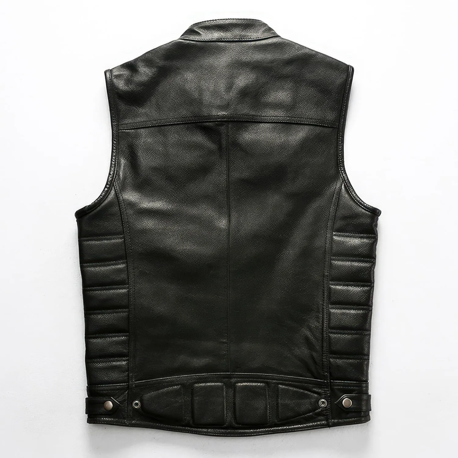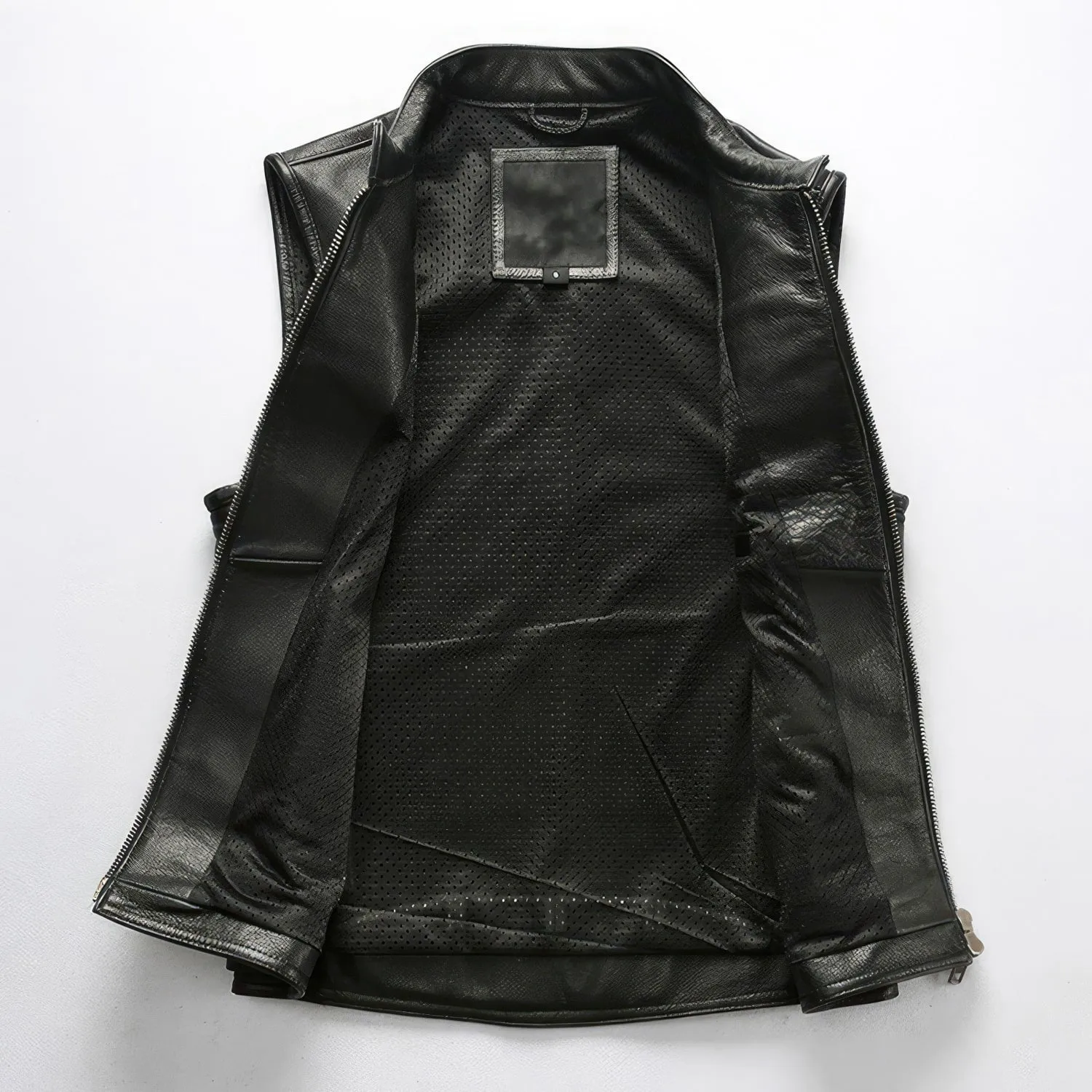 Mens Biker Black Genuine Cowhide Sleeveless Vest Quilted Zip-Up Moto Lightweight Classic Smooth Slim Fit Leather Waistcoat
