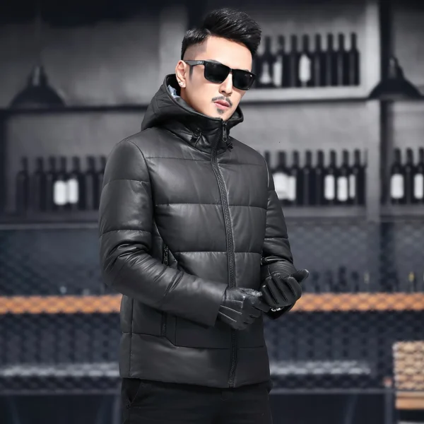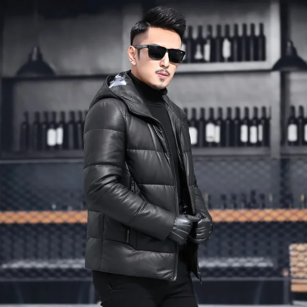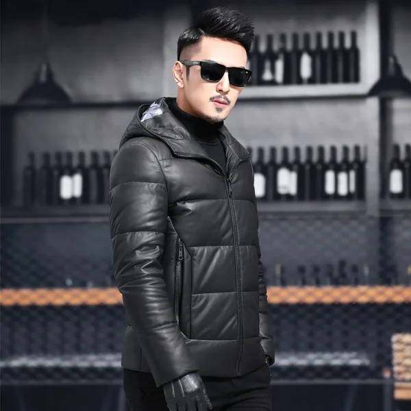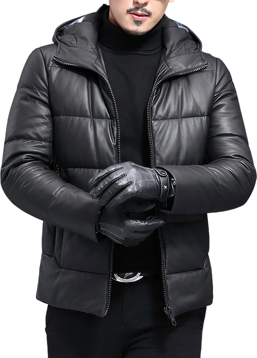 Mens Black Genuine Sheepskin Hooded Winter Warm Thick Casual Baggy Padded Puffer Lightweight Insulated Parka Leather Jacket