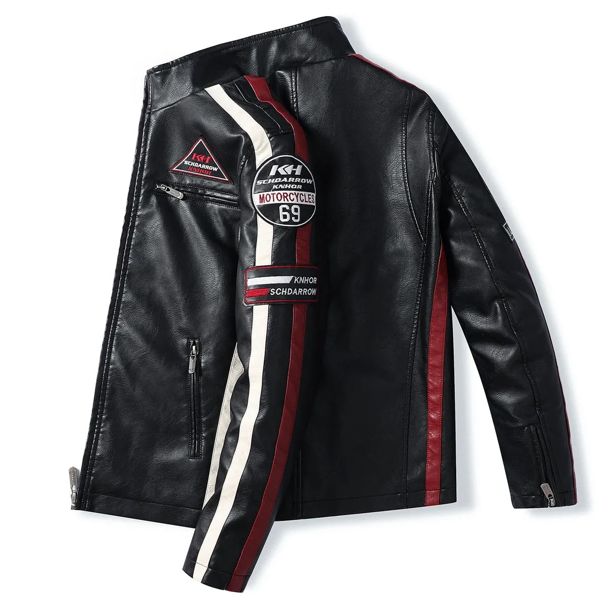 Mens Black Rider Genuine Sheepskin Stand Collar Cool Embroidery Patch Aviator Fashionable Casual Motorcycle Biker Leather Jacket