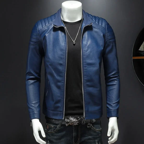 Mens Blue Biker PU Stand Collar Korean Style Quilted Shoulders Motorcycle Rider Smooth Fashionable Casual Classic Faux Leather Jacket