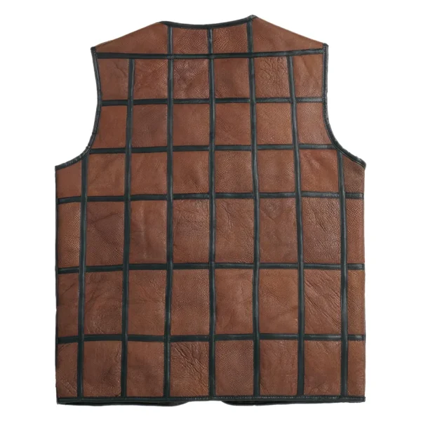 Mens Brown Genuine Sheepskin Leather Black Stripped Design Vest Classic Fashion Casual Distressed V-Neck Leather Waistcoat