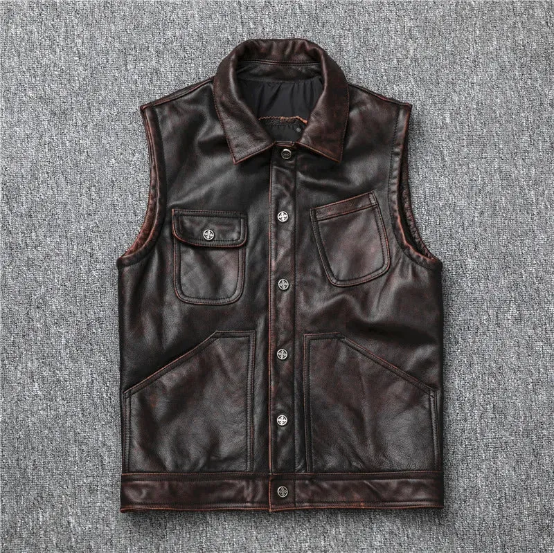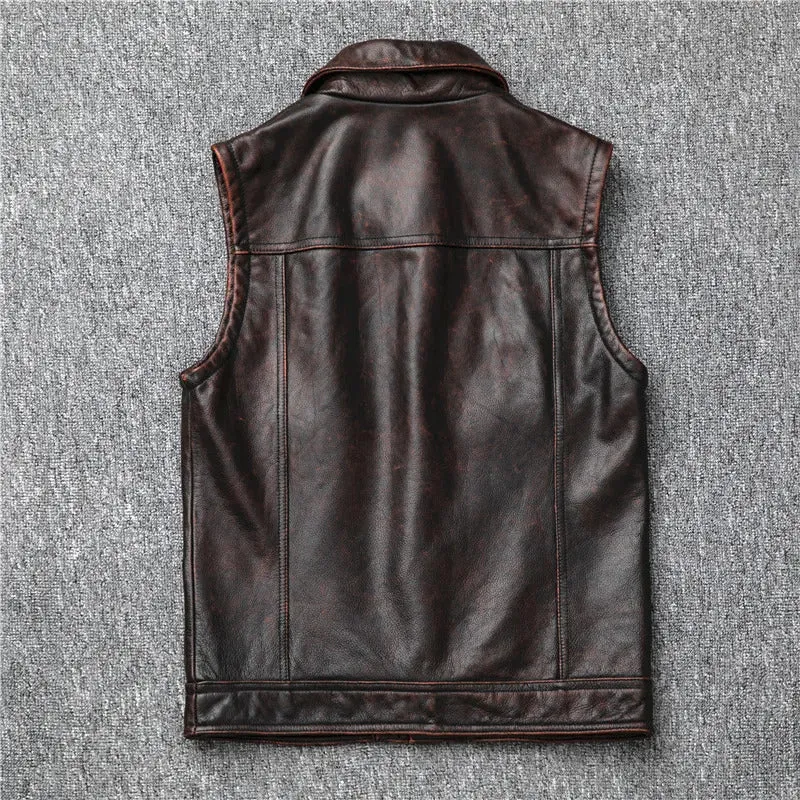 Men’s Genuine Leather Dark Brown Vintage Cowhide Motorcycle Vest