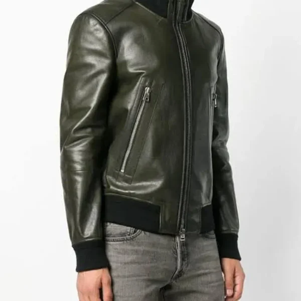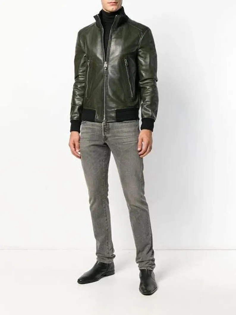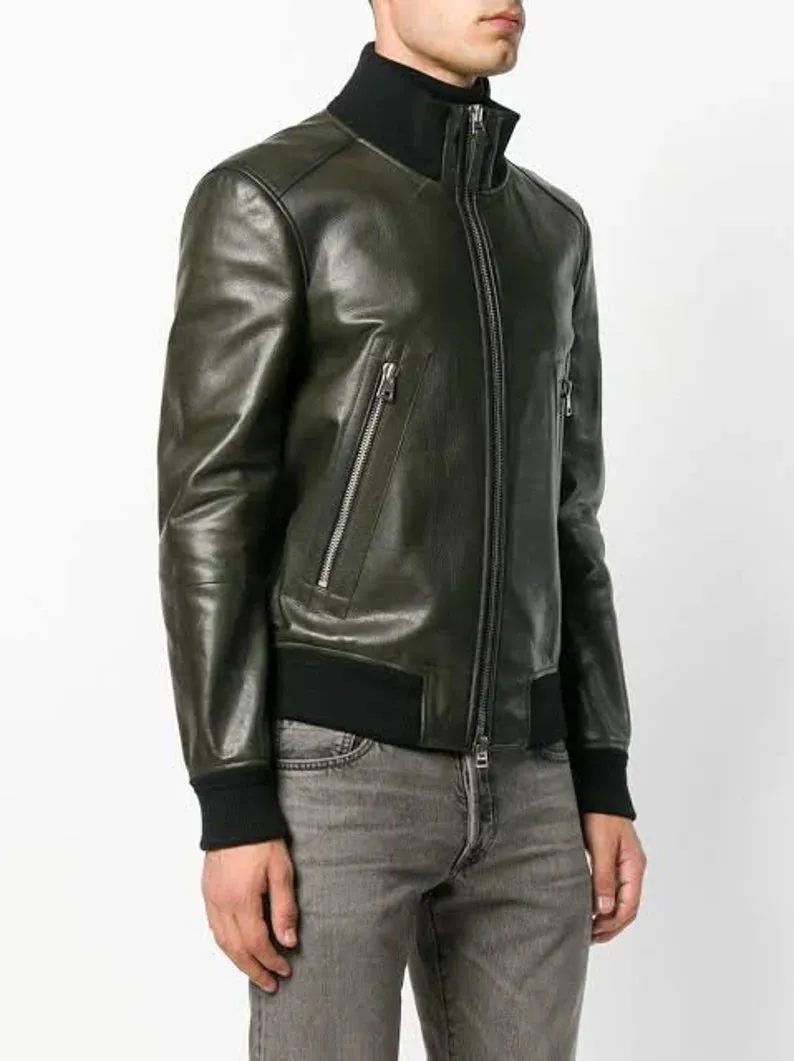 Men’s Green Casual Motorcycle Biker Leather Jacket