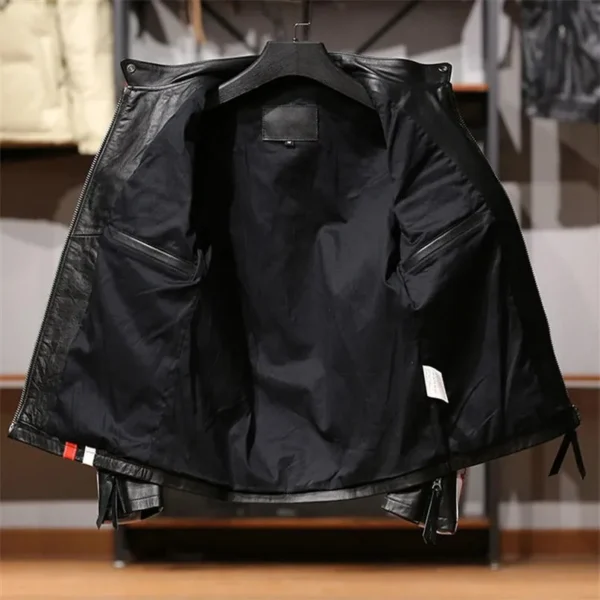 Be the first to review “Men’s Knight J100 Genuine Leather Jacket with Stand Collar & Red Stripe”