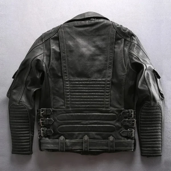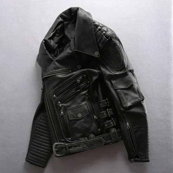 Men’s Punk Style Genuine Cowhide Leather Motorcycle Jacket with Pockets