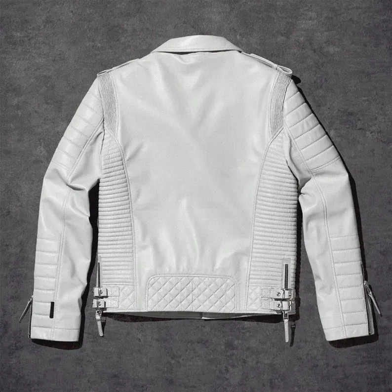 Men’s White Biker Leather Jacket – Motorcycle Style White Leather Jacket