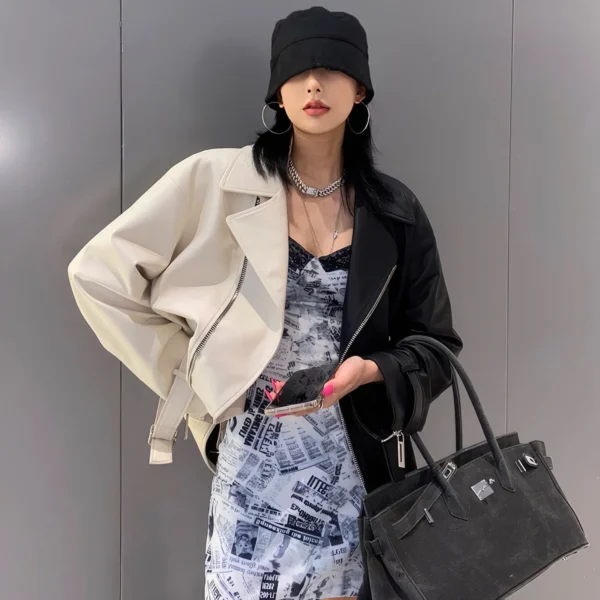 Womens Black & Beige Genuine Sheepskin Lapel Collar Moto Biker Casual Classic Loose Oversized Café Racer Asymmetric Leather Jacket