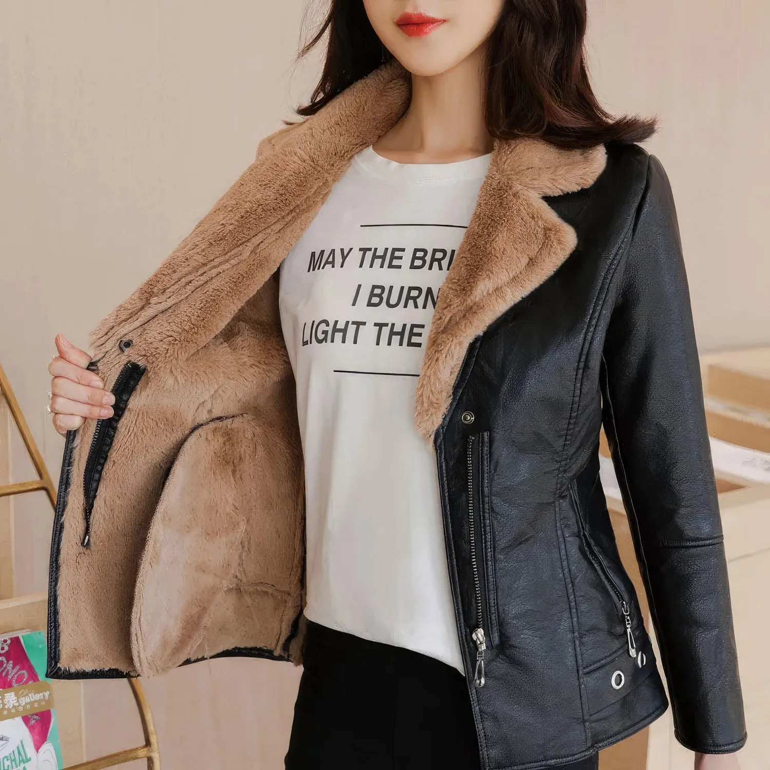 Womens Black Biker Genuine Sheepskin Sherpa Shearling Faux Fur Lined Café Racer Korean Fashion Motorcycle Slim Fit Leather Jacket