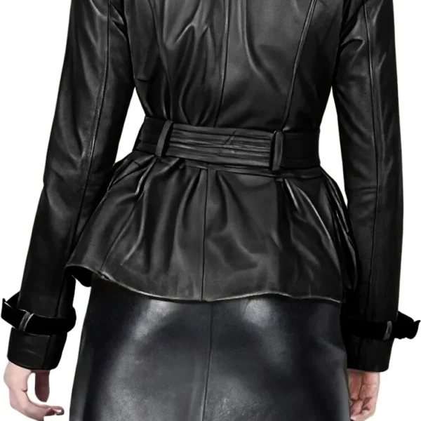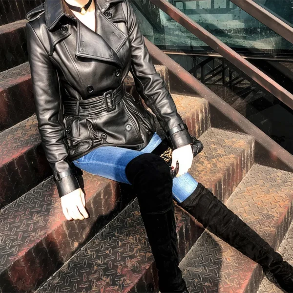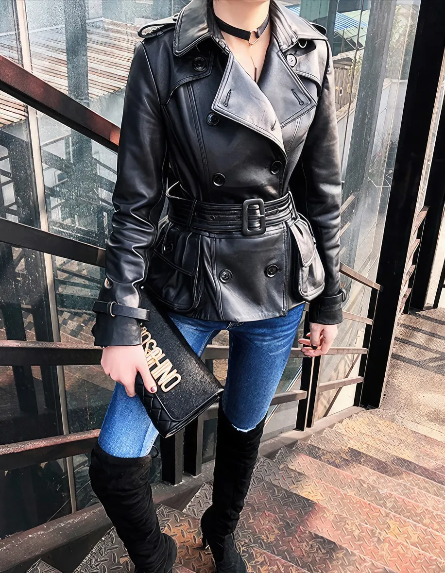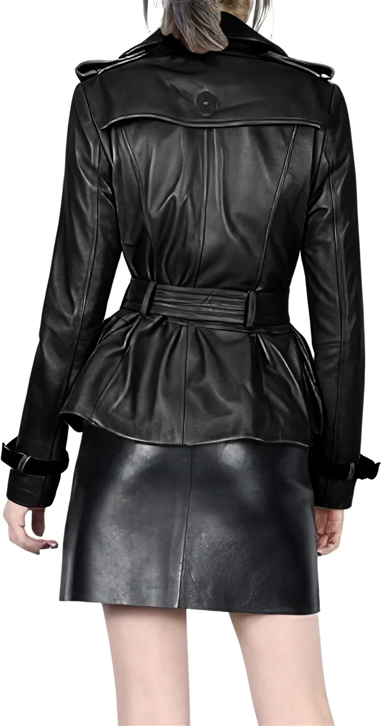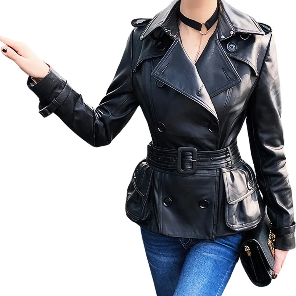 Womens Black Genuine Sheepskin Double Breasted Classic Moto Racing High-Street Style Belted Short Leather Trench Coat