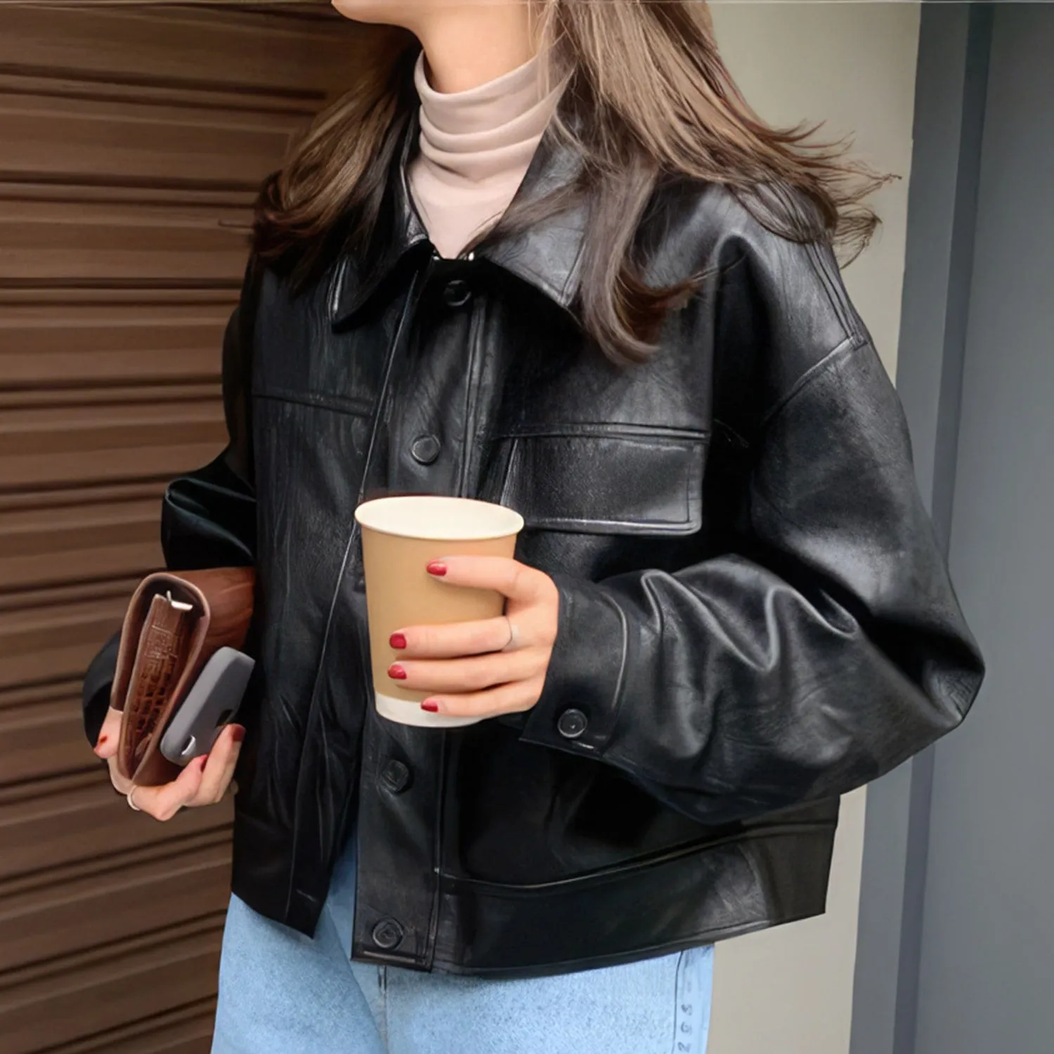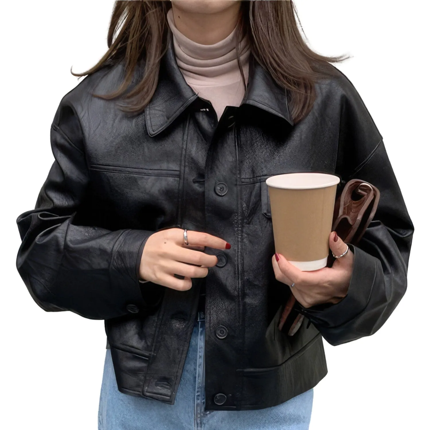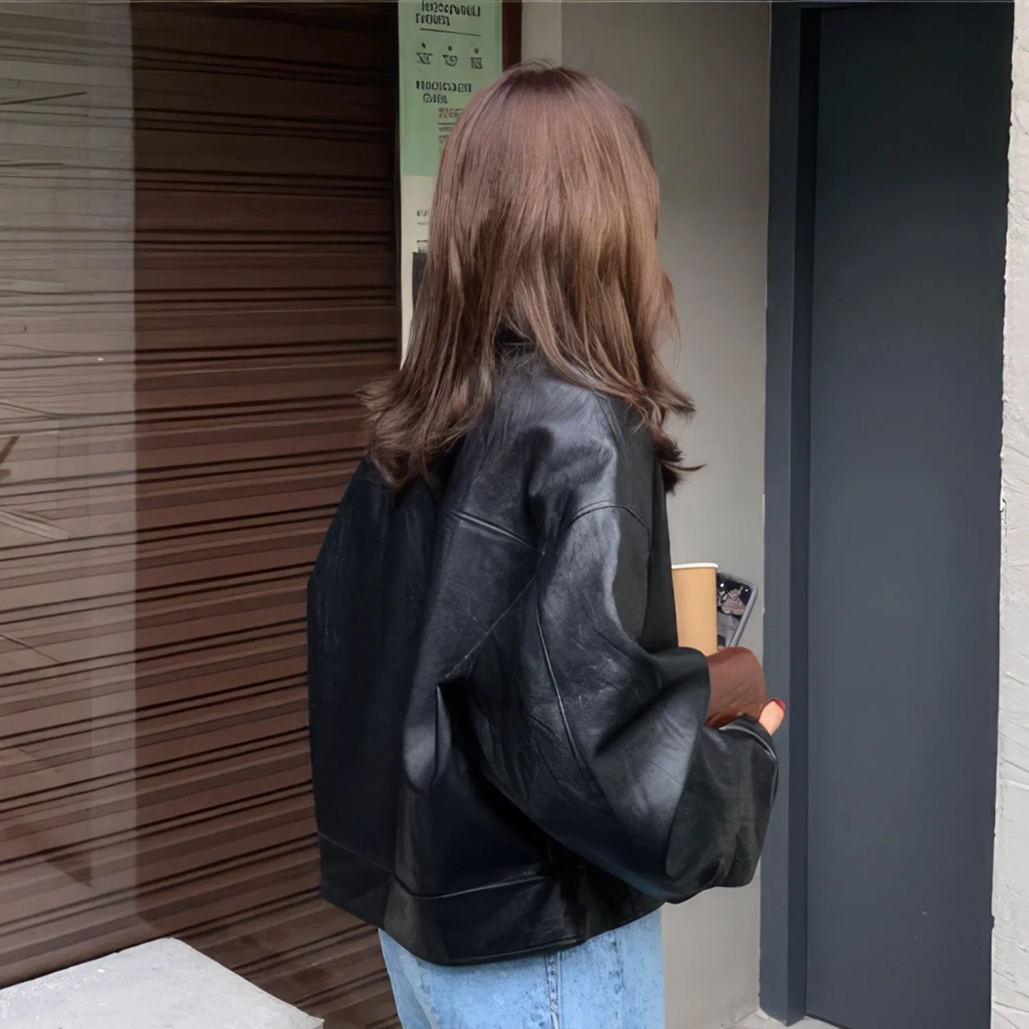 Womens Black Genuine Sheepskin Drop Shoulders Casual Classic Motor Biker Racer Short Fashionable Lightweight Leather Jacket