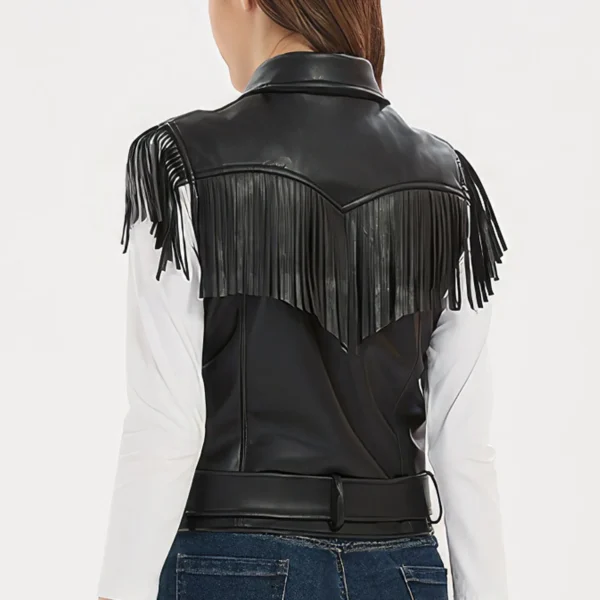 Womens Black Genuine Sheepskin Vest Tassels Sleeveless Sporty Moto Rider Mid-Western Slim Fit Fringe Leather Waistcoat