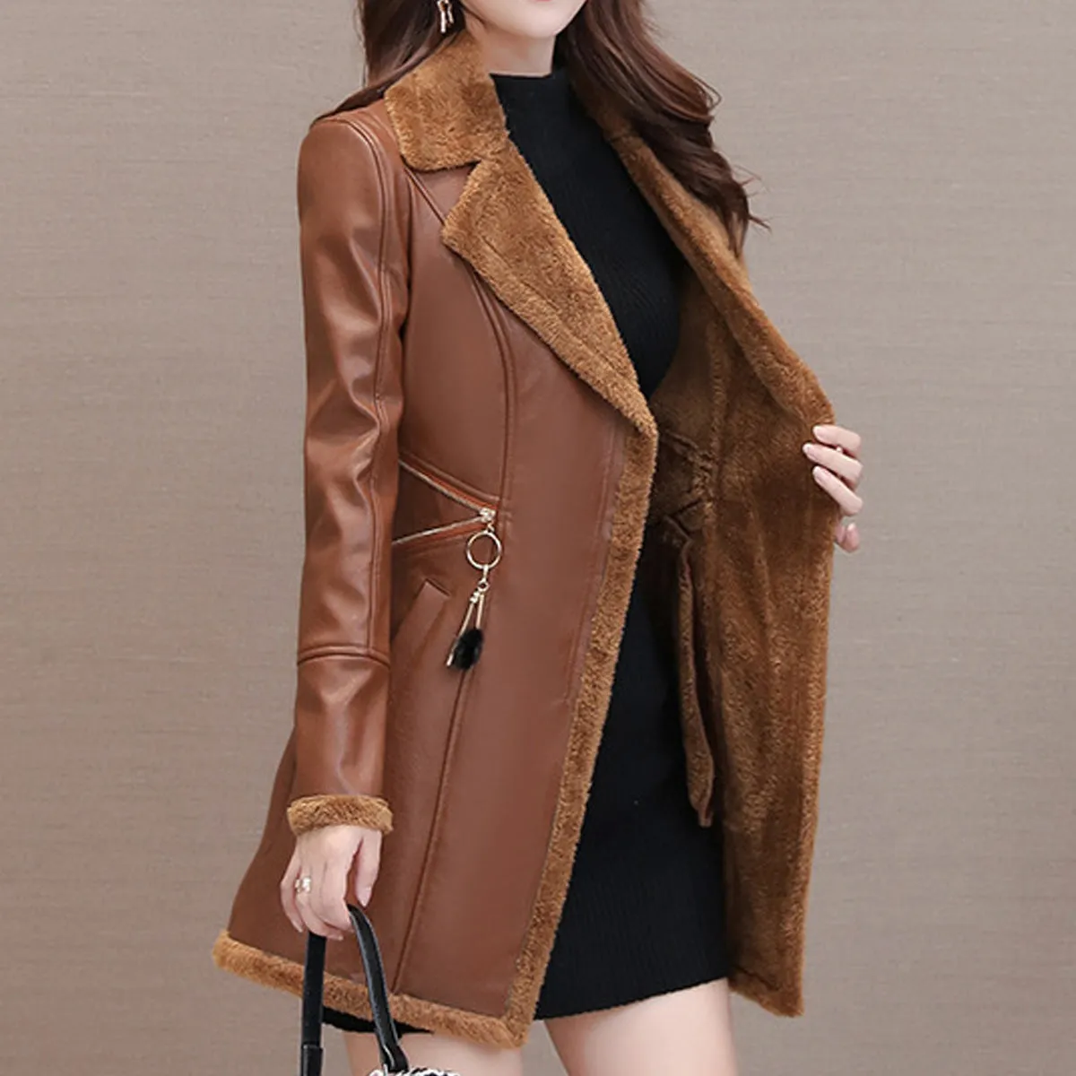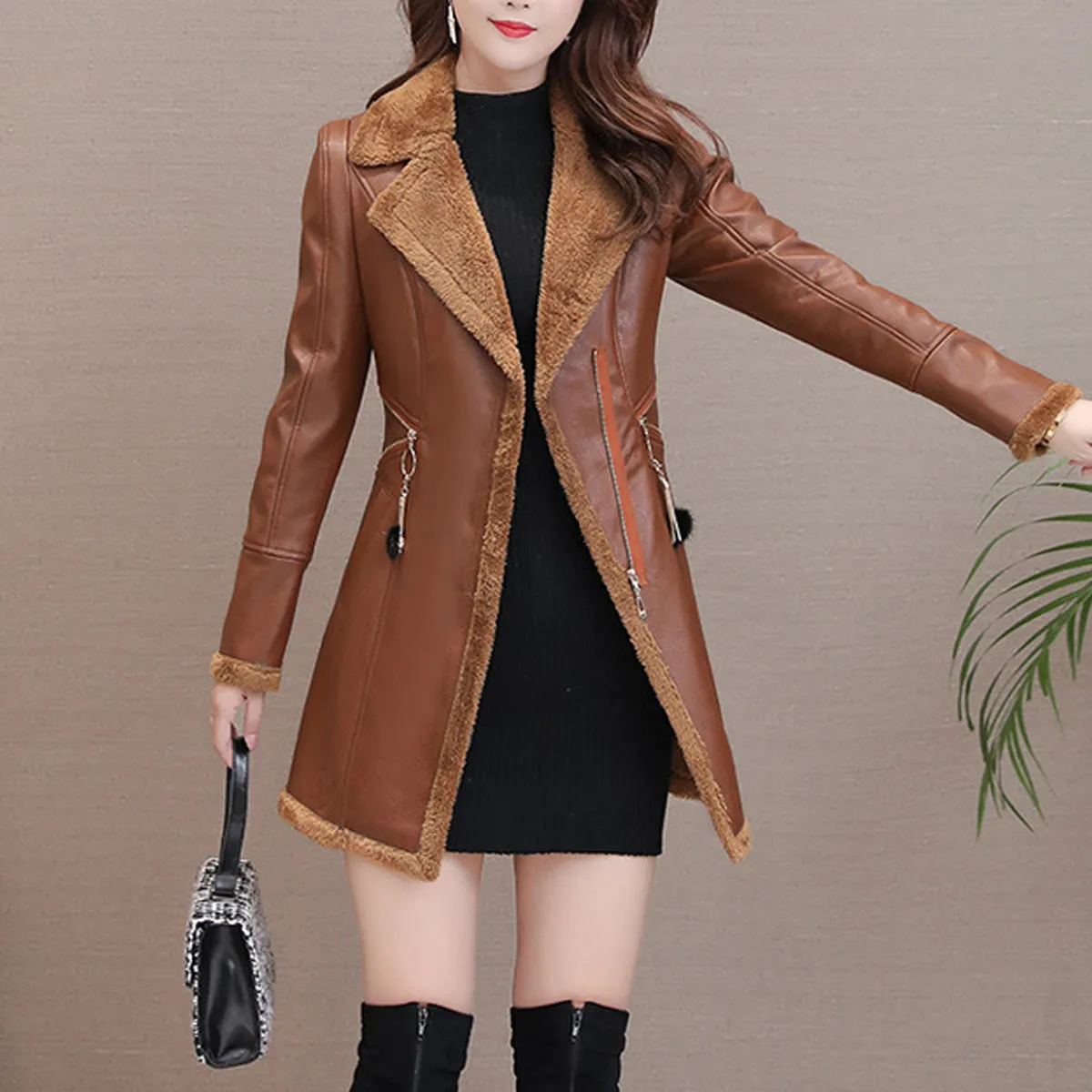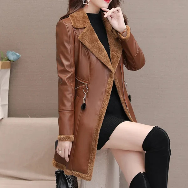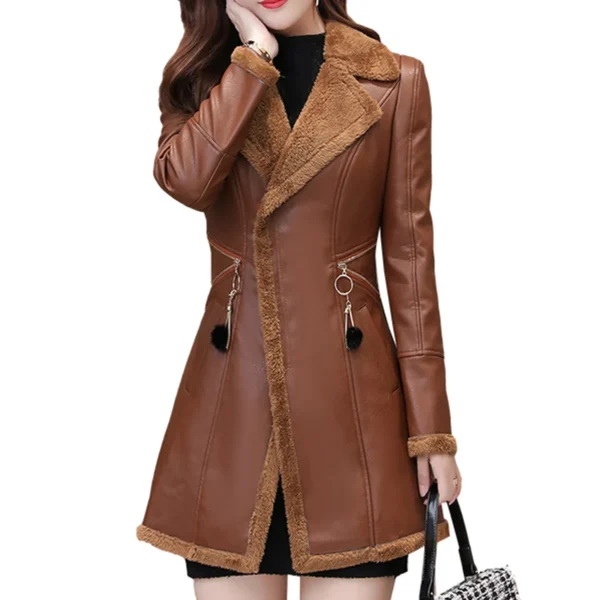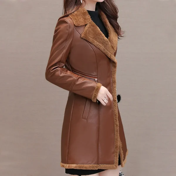 Womens Brown Genuine Sheepskin Lapel Collar Sherpa Shearling Faux Fur Lined Thick Warm Casual Classic Single Breasted Trench Style Leather Coat Jacket