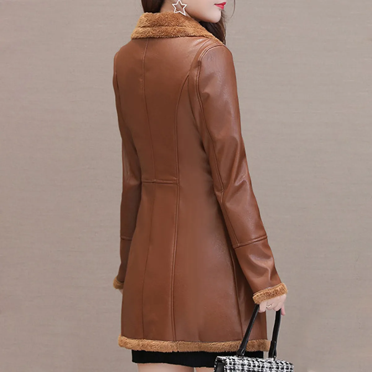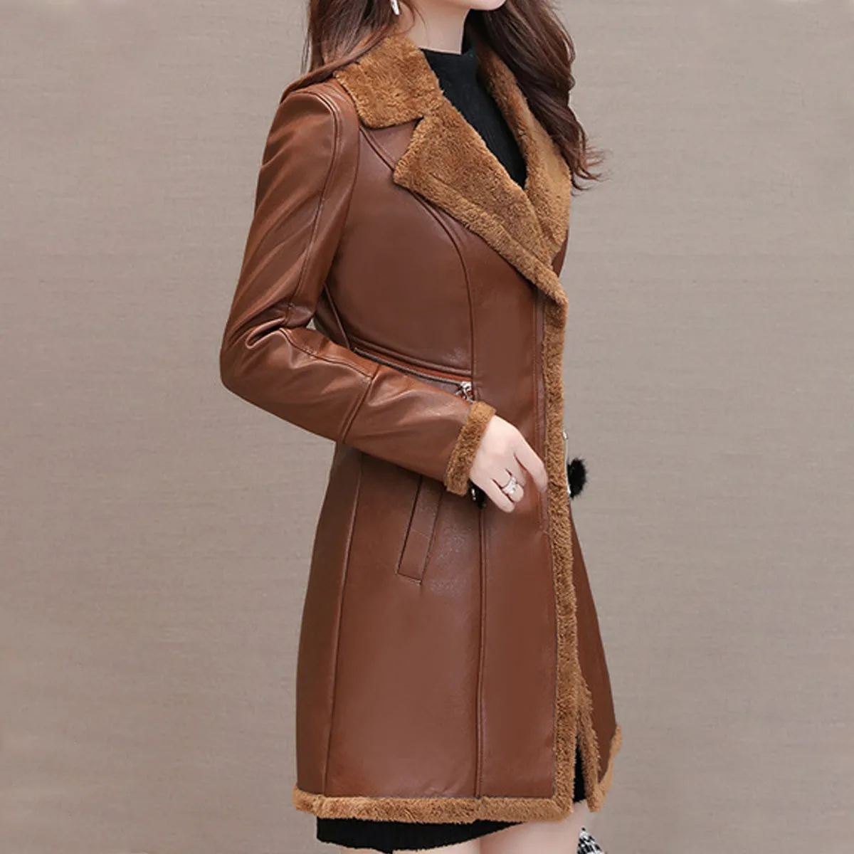 Be the first to review “Womens Brown Genuine Sheepskin Lapel Collar Sherpa Shearling Faux Fur Lined Thick Warm Casual Classic Single Breasted Trench Style Leather Coat Jacket”