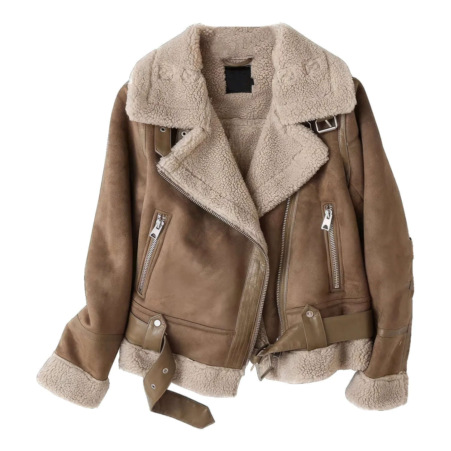 Be the first to review “Womens Brown Vintage Genuine Suede Lambskin Crossover Lapel Collar Sherpa Shearling Faux Fur Lined Sporty Moto Biker Asymmetric Leather Jacket”