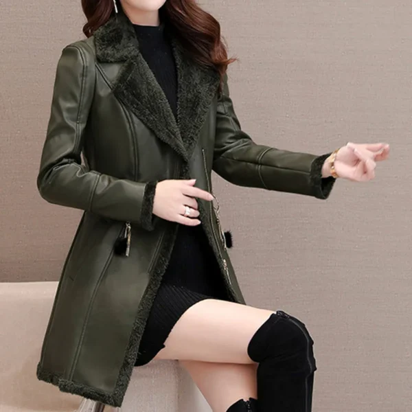 Womens Green Genuine Sheepskin Lapel Collar Sherpa Shearling Faux Fur Lined Thick Warm Casual Classic Single Breasted Trench Style Leather Coat Jacket