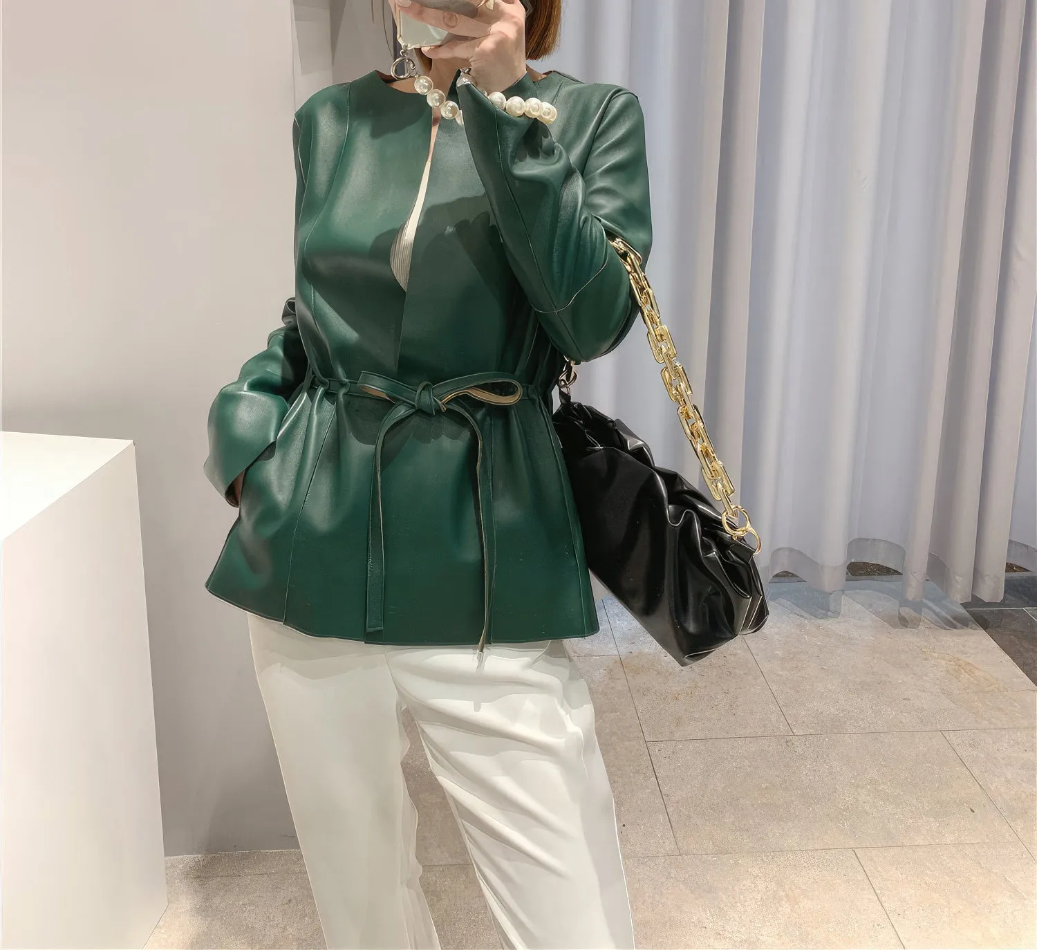Be the first to review “Womens Green Genuine Sheepskin Round Neck Casual European Streetwear Top Fashion Pleated Simple Classic Leather Coat”
