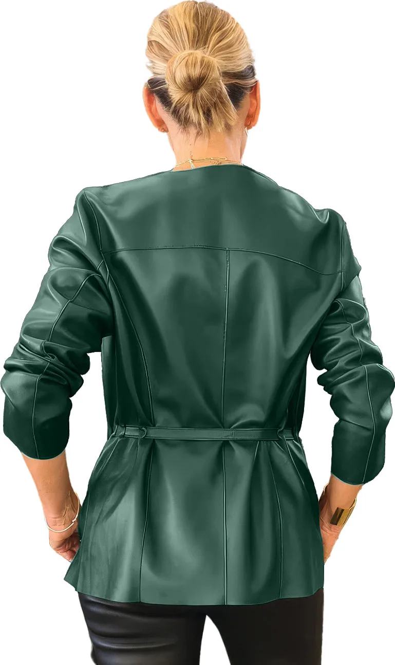 Womens Green Genuine Sheepskin Round Neck Casual European Streetwear Top Fashion Pleated Simple Classic Leather Coat