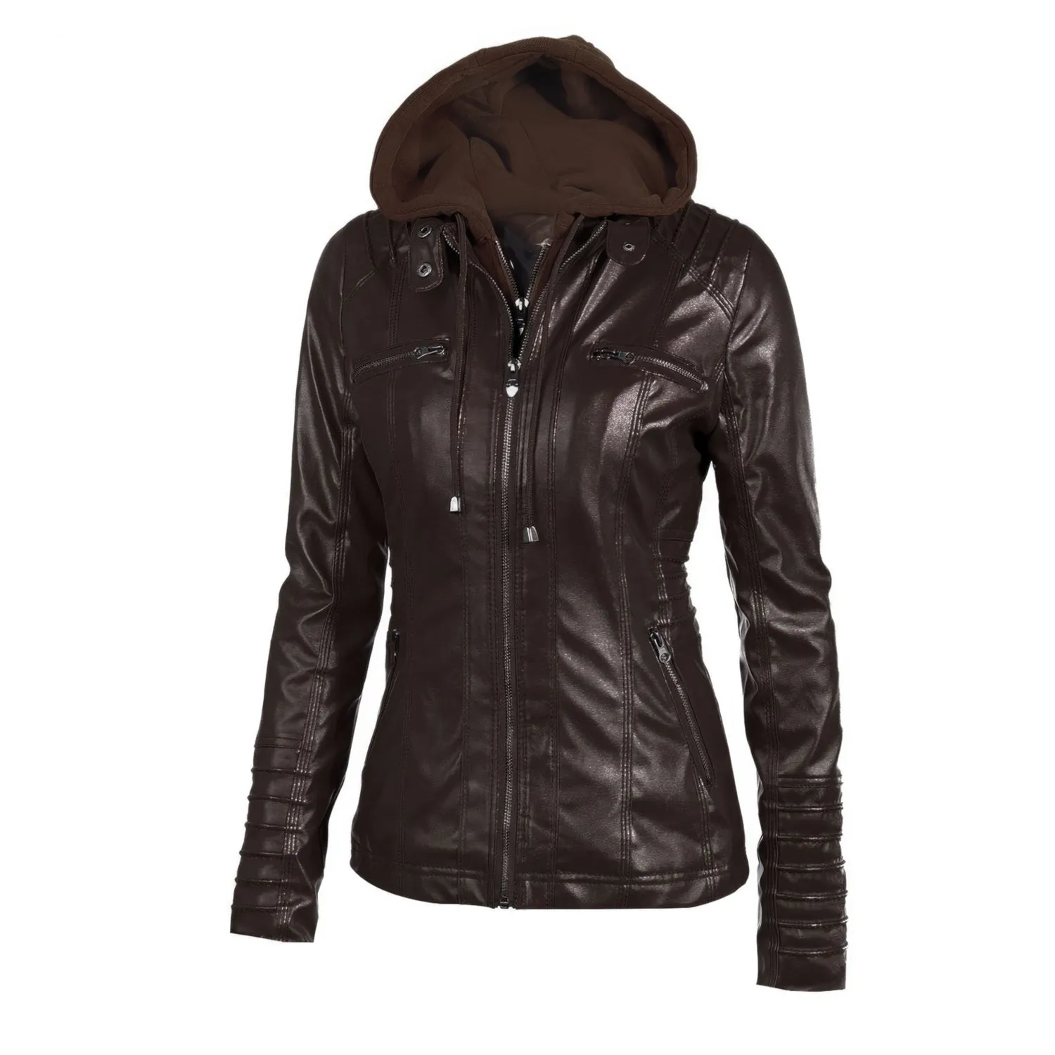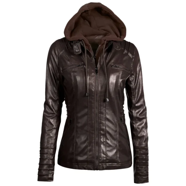 Womens Racer Brown Genuine Sheepskin Detachable Hooded Sporty Moto Scooter Racer Slim Fit Casual Classic Leather Jacket