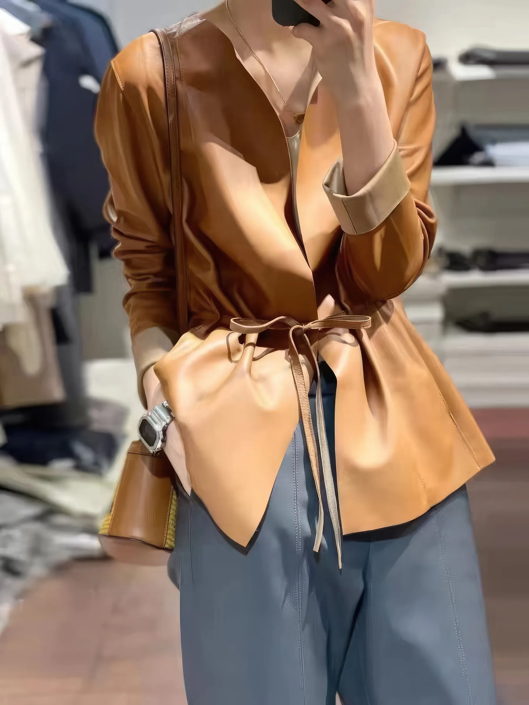 Be the first to review “Womens Sepia Brown Genuine Sheepskin Round Neck Casual European Streetwear Top Fashion Pleated Simple Classic Leather Coat”